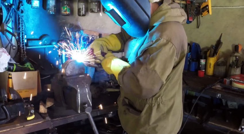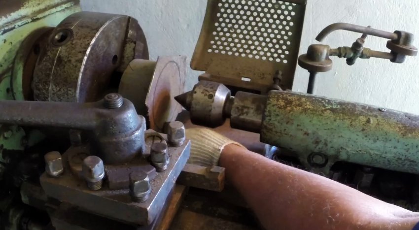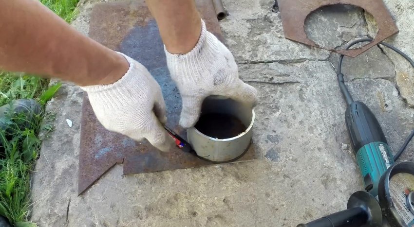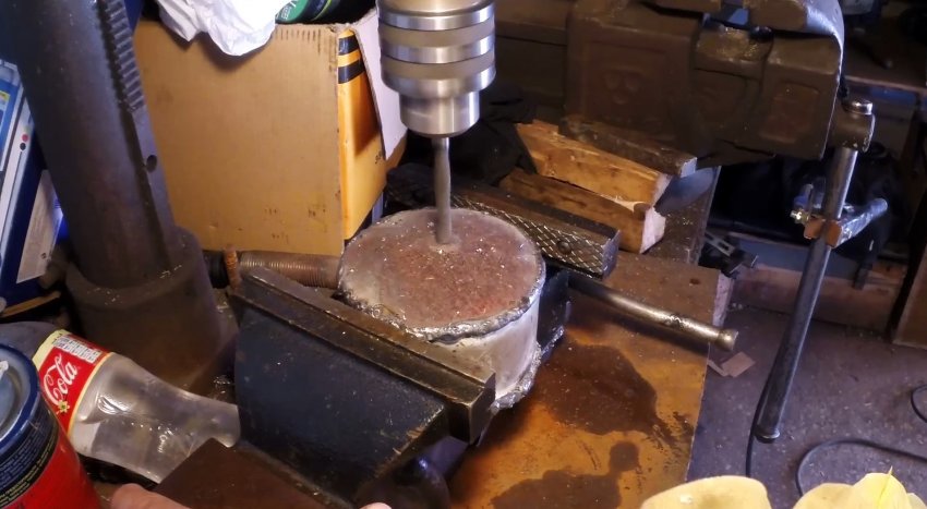 На токарном станке один круг превращаем в небольшой по высоте конус, в центре которого просверливаем отверстие диаметром около 8 мм. Плоский круг привариваем к кольцу снизу, а конусный круг – сверху.