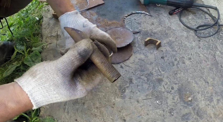 В боковой стенке кольца в продольном направлении выполняем продолговатое отверстие, к которому по касательной привариваем трубчатый сгон, предварительно сформировав косой срез для плотного прилегания к стенке кольца.