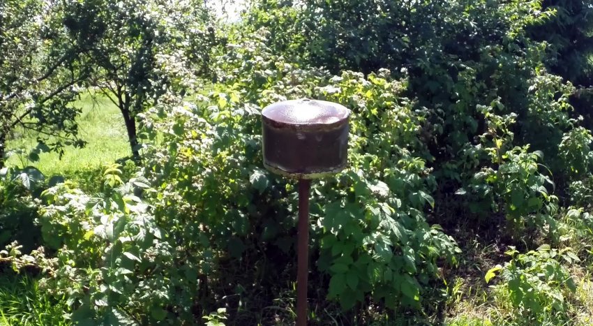 К центру донца полученной конструкции вертикально вниз привариваем пруток необходимой длины с простейшим инерционным молотком. Втыкаем пруток в грунт в том месте, где необходим полив, и добиваем пруток в землю с помощью инерционного молотка.