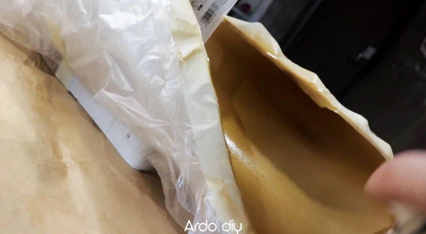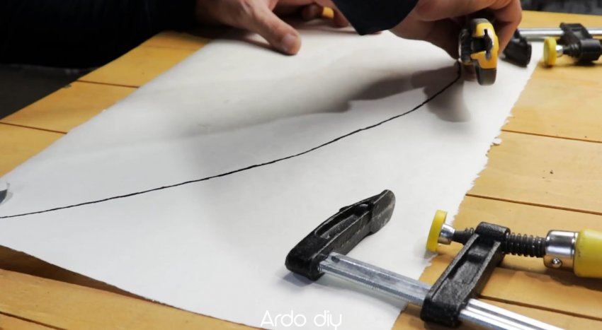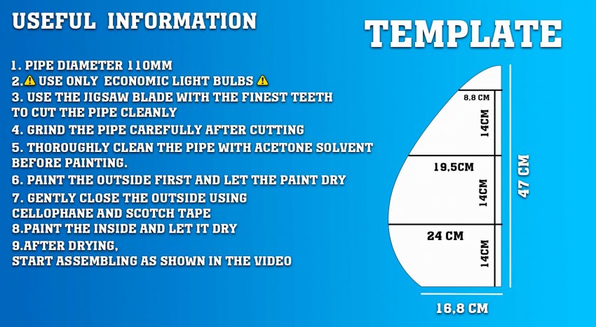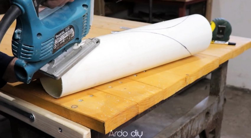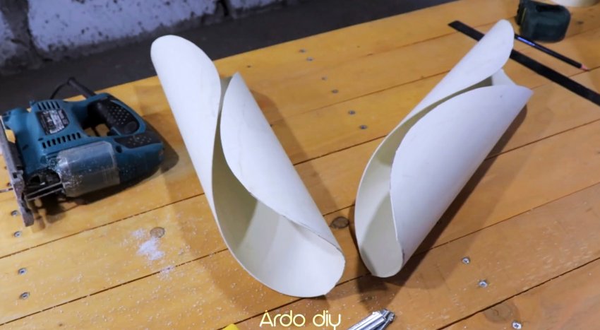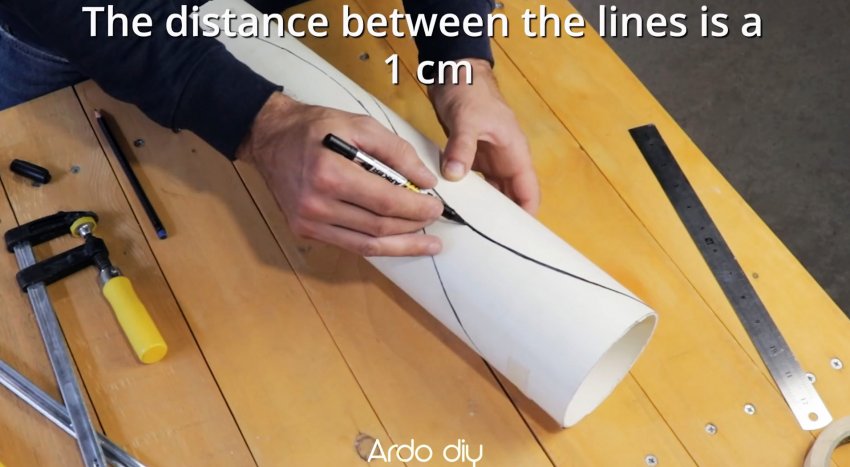 Теперь нужно начертить на трубах 2 волны, чтобы вырезать между ними пластик. Этот зазор нужен для выхода света ламп. В центре стенки разреза должны сближаться на 10 мм, а по краям отдаляться. Чтобы волны на всех заготовка были одинаковыми, вырезаем шаблон из бумаги, и обводим волны по нему.