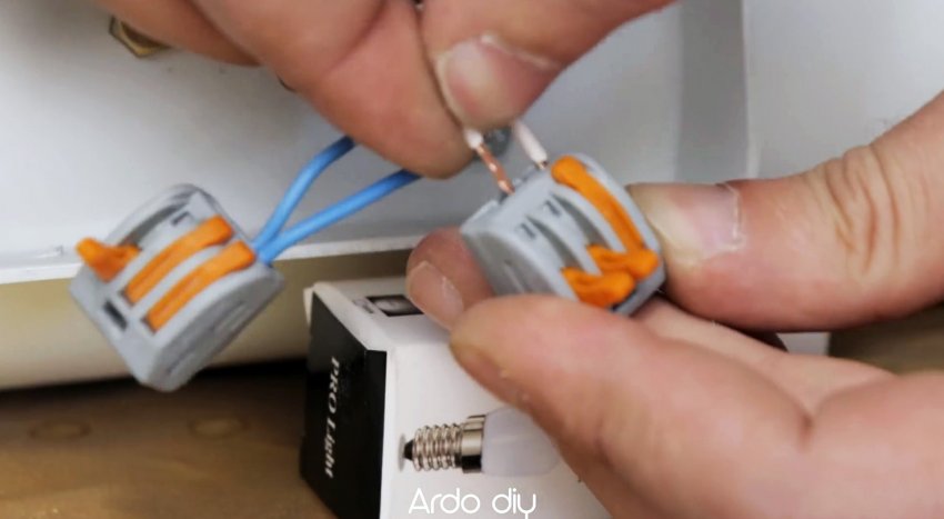 После высыхания краски можно заняться электромонтажом. Подключаем патроны, и прикручиваем их провода к подводке в стене.