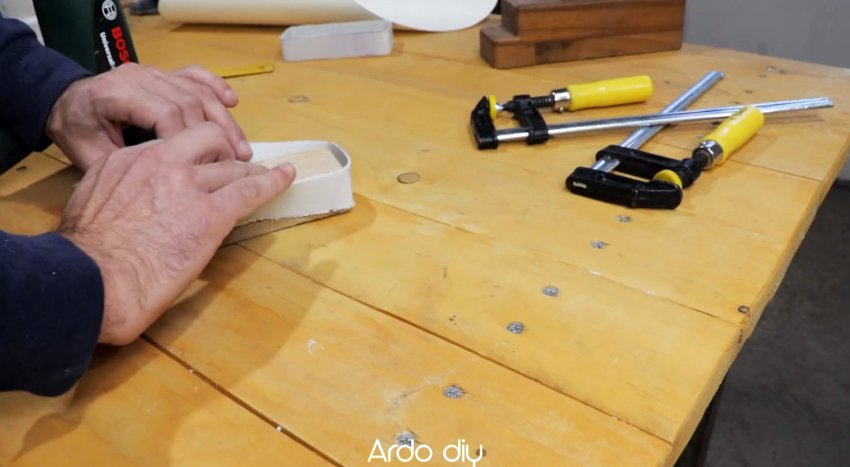 Затем выпиливаем брусок шириной 50 мм и длиной 125 мм. Греем кольцо и натягиваем на него. Получаем в результате рамку под кронштейн.