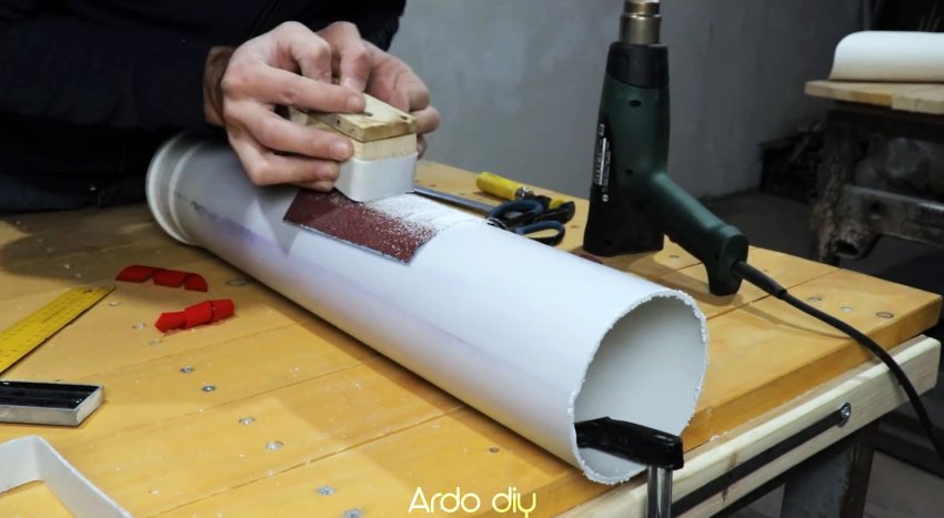 Затем затираем края пропилов наждачной бумагой. Сразу же шкурим трубы шкуркой Р320, чтобы сделать поверхности матовыми для покраски. Если на заготовках есть надписи или линии, то соскребаем их лезвием ножа.
