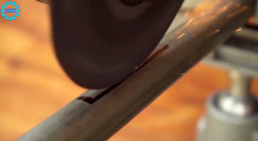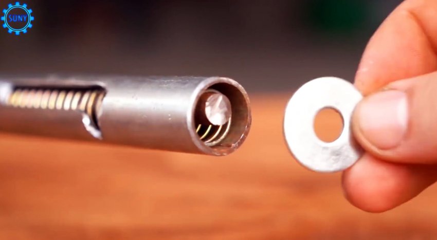 В край трубы противоположный от пропила вваривается шайба. Затем вставляется прутик, и на него несколько пружин сжатия. Далее открытый край трубки также заваривается шайбой.
