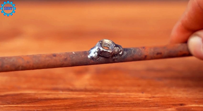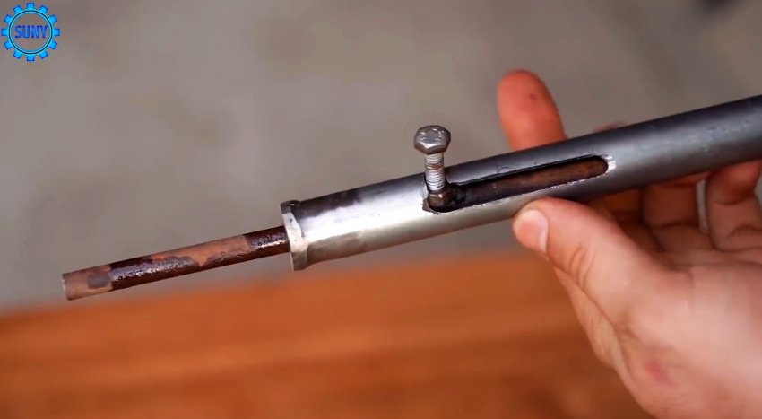Затем подготавливается стальной пруток диаметром 6-8 мм на 10 см более длинный, чем трубка. За 7 см от края к нему сбоку приваривается гайка М6. Ее внутренняя резьба должна остаться целой.