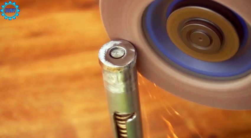 Во вваренную гайку нужно закрутить болтик, так, чтобы пружины упирались в него. Теперь остается только заточить край прутка, чтобы получить пику.