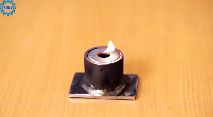 Теперь если залить внутрь несколько кубиков керосина, спирта, бензина или другого горючего, и его разжечь, то получим свечу с пламенем в центре шайбы. Его температура будет выше, чем у парафиновой свечки. Таким образом, ее можно применять для плавки пластмасс и т.д.