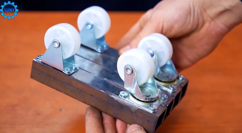 Полученная платформа просверливается по углам, и к ней прикручиваются 4 мебельных колесика. Нужно 2 поворотных и 2 обычных.