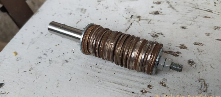 Далее, насадив монеты, прижал их гайкой сверху, плюс добавил стопорную гайку. В итоге получилась такая заготовка.