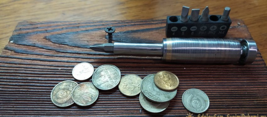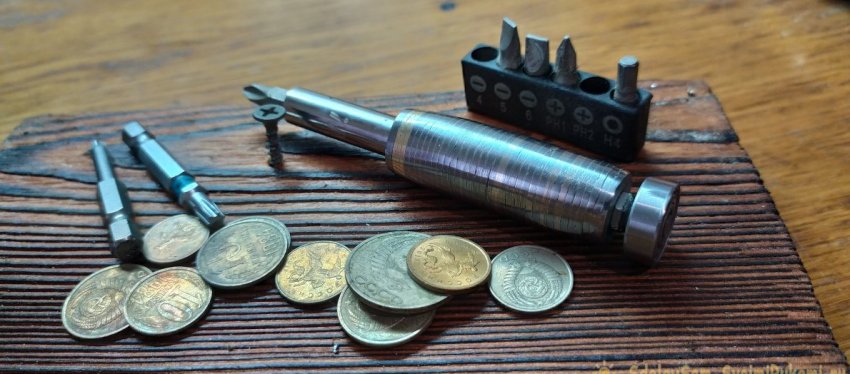 Непорядок, подумал я. Надо что-то сделать. И тут я вспомнил, что у меня в ящике лежит отличный переходник для бит шуруповерта. Вот бы ему какую нибудь рукоятку придумать и получилась бы отличная отвертка! На глаза попалась старая банка с монетами СССР… Наверное в каждом доме такая осталась. Было принято решение что-то делать из них.