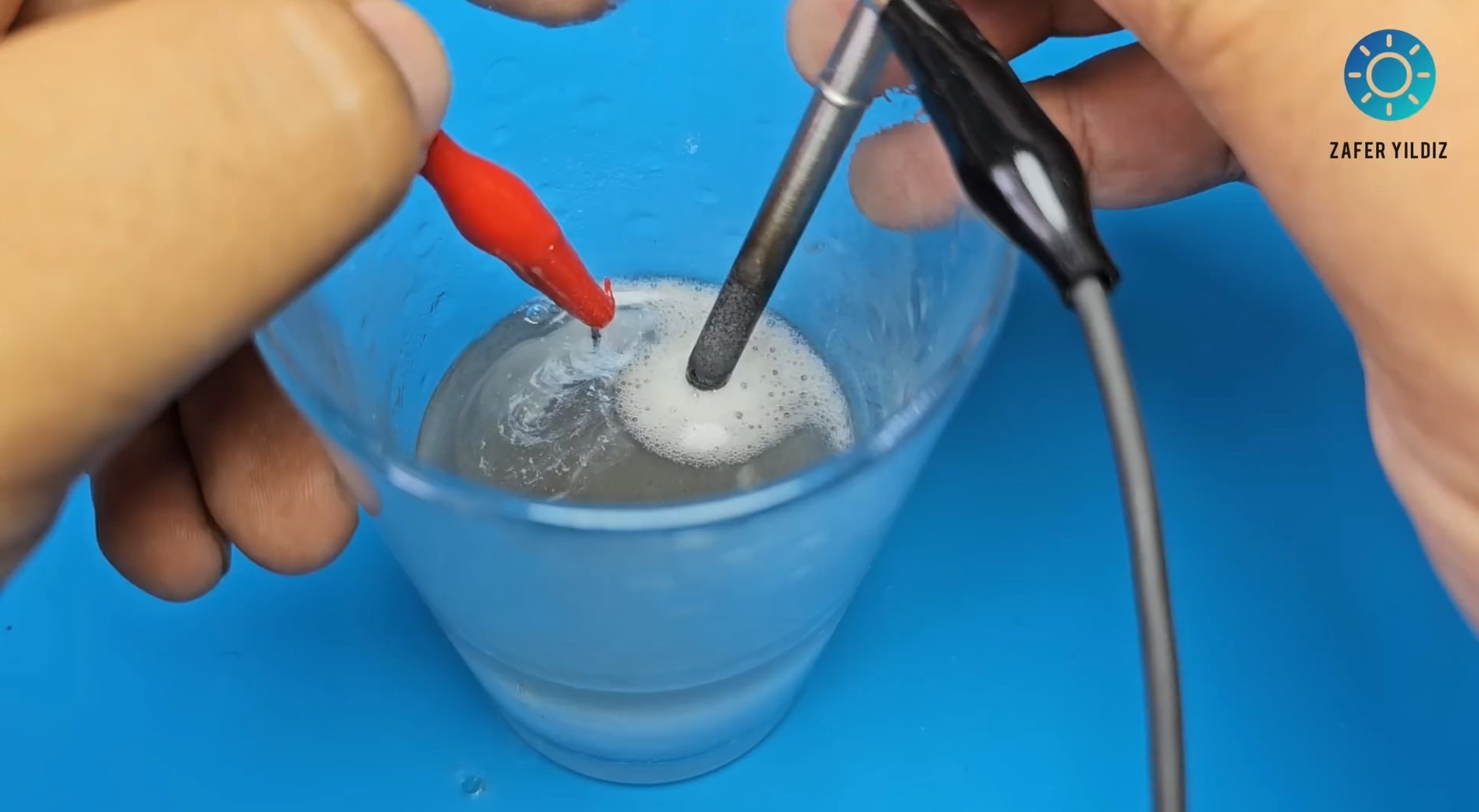 Для эксперимента, ко второму, минусовому выводу блока подключим очищенную медную проволоку. Включим блок и опустим электроды в раствор.