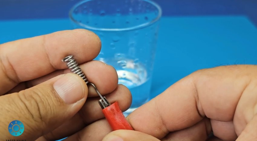 Значит все работает как надо. Далее переходим непосредственно к восстановлению жала паяльника. Спираль подключаем к плюсу, а жало к минусу.