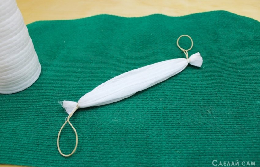 Собираю салфетку в гармошку и фиксирую по краям резинкой-самозатягивающиеся узлы.