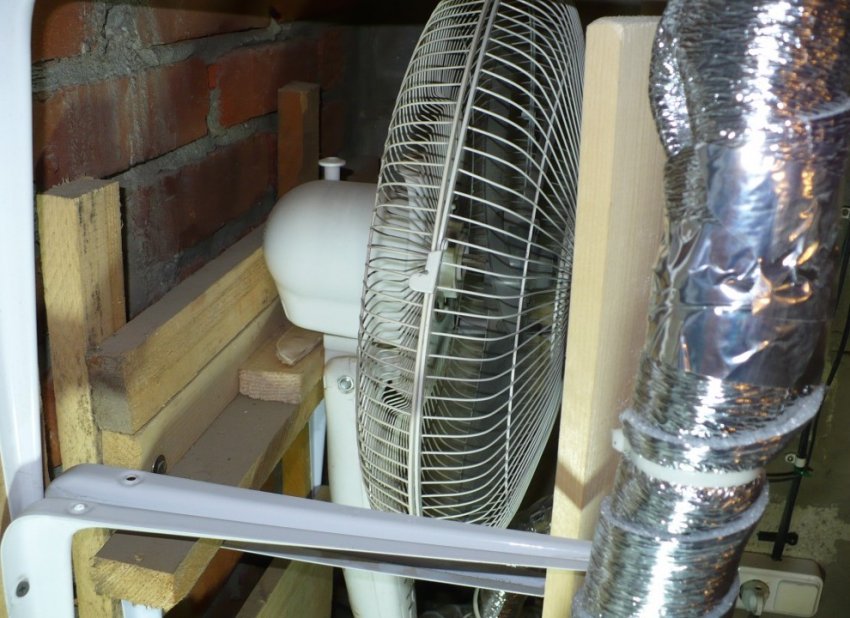 Выдувает тепло самый обычный старый комнатный вентилятор.