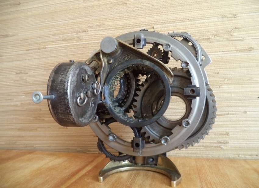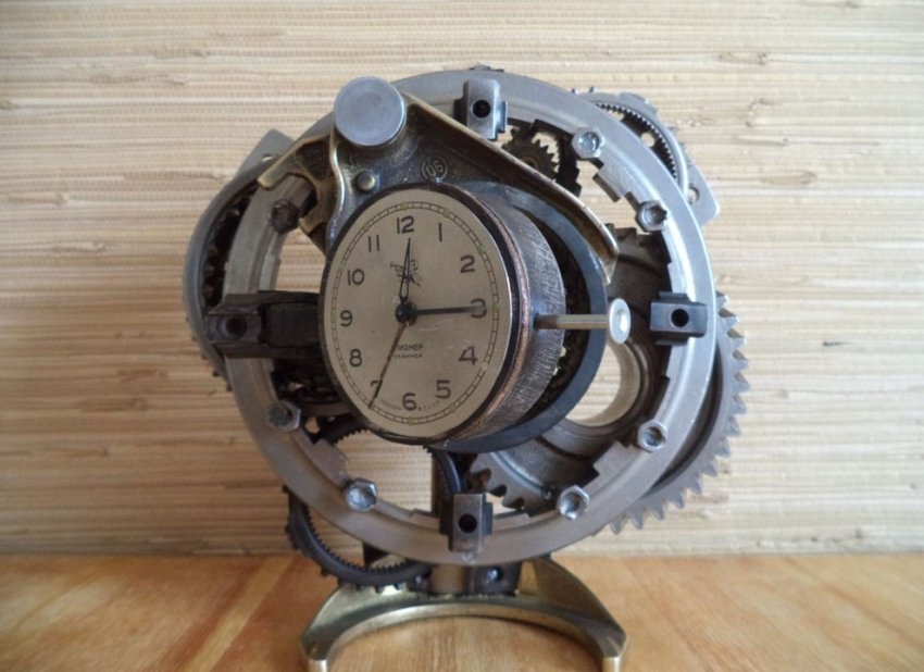 Приветствую всех! Представляю часы механические с заводом. Собраны из деталей АКПП и МКПП. Часы "Пионер" 11 камней, 1951 год. Петля рокер клапана ДВС. Солдатик тормозного механизма. Гайки. Сварочные работы. Вначале был кварцевый механизм с внешней батарейкой АА. Но никак не вязалось с общей концепцией. Поэтому только механика!!!! Завод механизма каждый день.