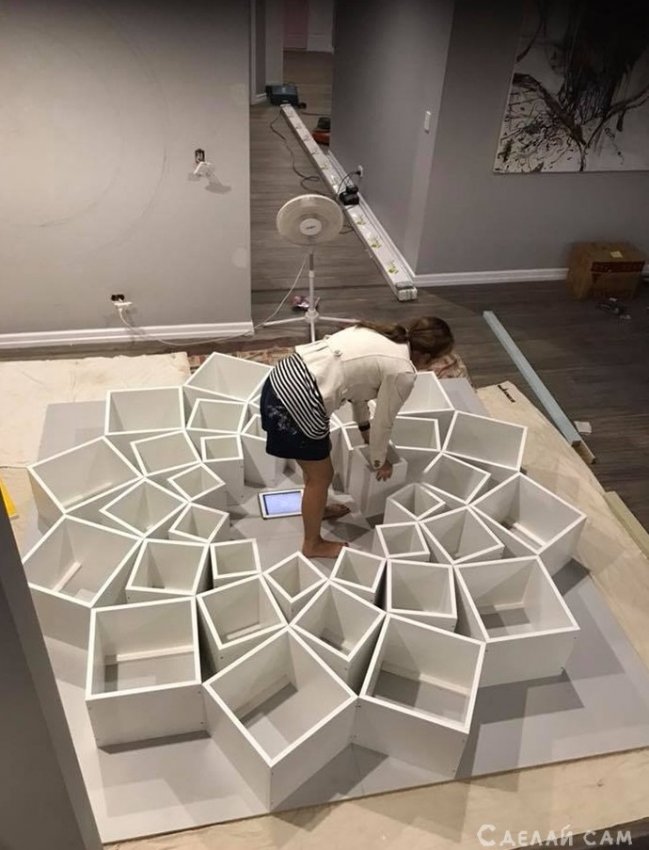 Суть идеи очень проста. Берем основу - толстый лист ДСП с белым покрытием. Из листов ламинированных делаем простые ящики разного размера. Далее складываем их симметрично, крепим к основе (стенке) с помощью саморезов. Основа крепится непосредственно к стене.