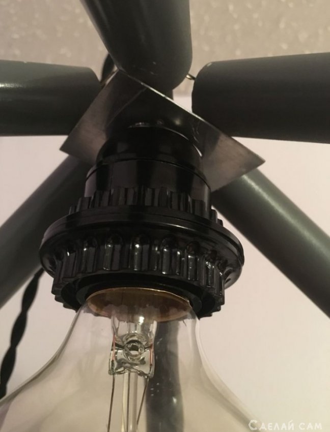 С помощью порошковой краски окрашиваем конструкцию. Получается однородная, цельная геометрически верная конструкция с лампой. Проще говоря - люстра.
