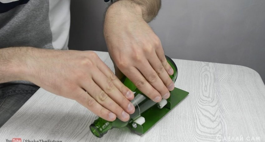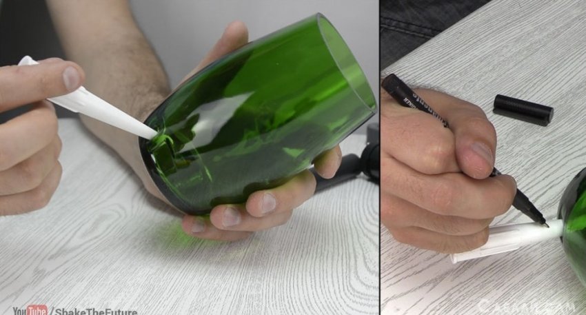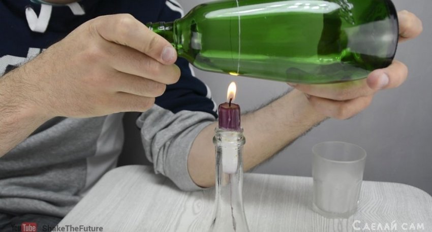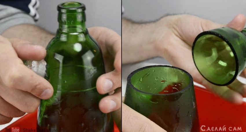Главная наша задача - разрезать бутылку наполовину. Есть много методов, начиная от вариантов с бензином, заканчивая более приземленный вариантами со стеклорезами и т.д. Я использовал самый безопасный метод, разрезку бутылки с свечи и льда.