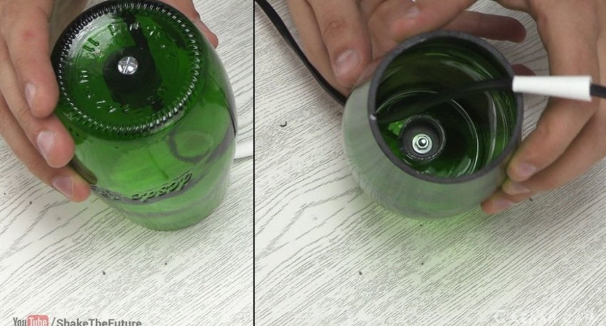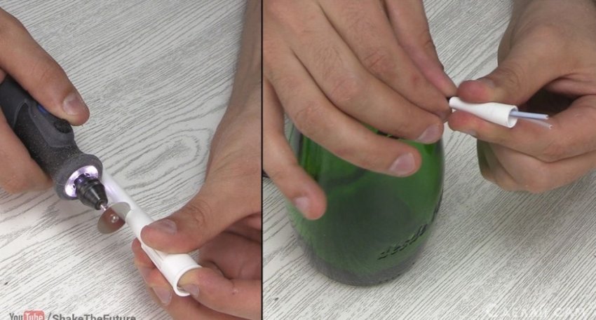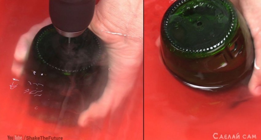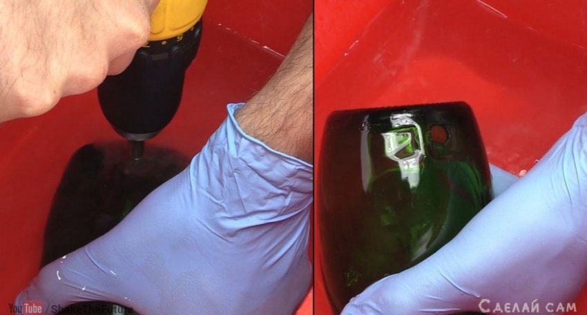 Сверлить бутылку можно только в воде, дабы она не треснула.