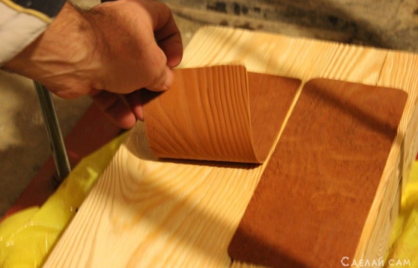 В качестве пресса можно попробовать использовать и несколько струбцин. Главное - обеспечить равномерность давления по все площади. Для этого кожу прокладываем между массивными, ровными брусками с гладкой поверхностью. Мы используем обрезки кухонных столешниц.