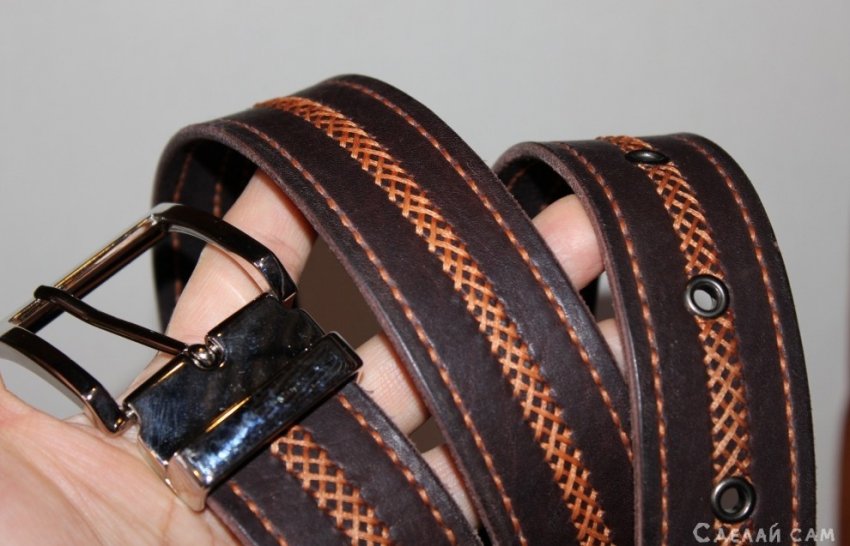 Делала еще два ремня уже из кожи хромового дубления, чепрак 3,5-4 мм. Т.к. кожа хромового дубления не поддается тиснению как кожа растительного дубления, то только на одном ремне получилось сделать тиснение штампами, другой я прошила фигурным швом.