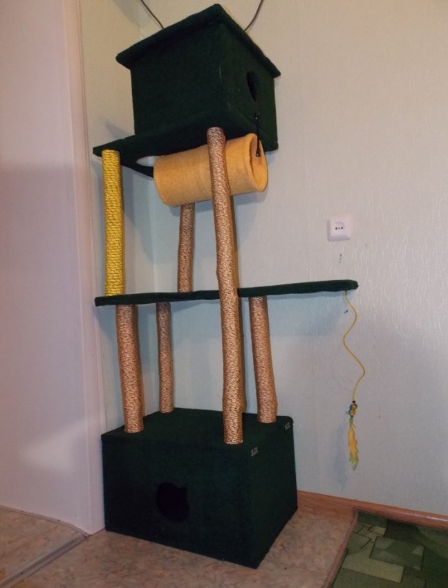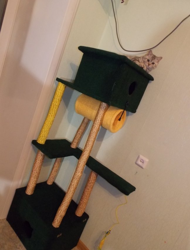 Доброго время суток Хочу поделиться с вами что у меня получилось за три вечера проведеных в гараже с помощью лобзика дрели и шуроповерта, потратился только на ткань,шнур и скрепки на степлер пиломатериал со старого пианино столбиков в лесу хватает))два фильтра автомобильный теперь вот ждем котят чтоб наблюдать и радоваться как резво они будут прыгать бегать по стойке