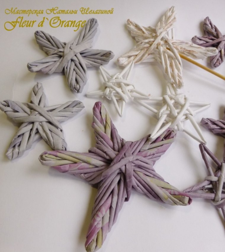 Эти звездочки выполнены из различных видов бумаги: дизайнерской, оберточной и глянцевых журналов (см.видео МК ниже). Для небольших изделий лучше использовать трубочки из более тонкой бумаги. Куда вы будете их использовать - подскажет ваша фантазия: это и украшения для елки и для новогоднего или Рождественского венка, звездочками можно украсить подарочные коробки или надеть на шпажку и использовать в декоре интерьера.