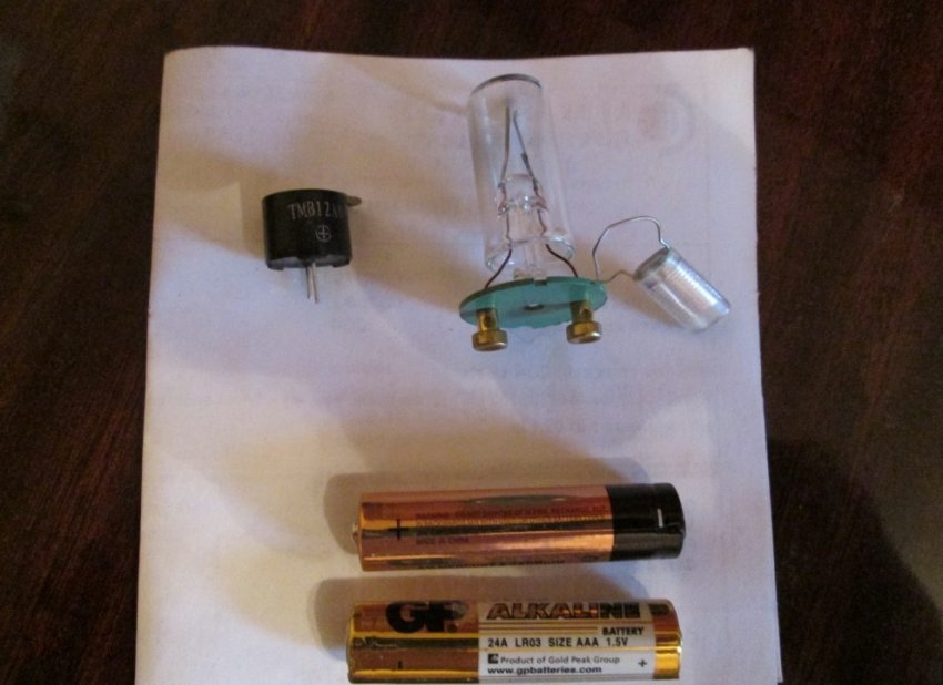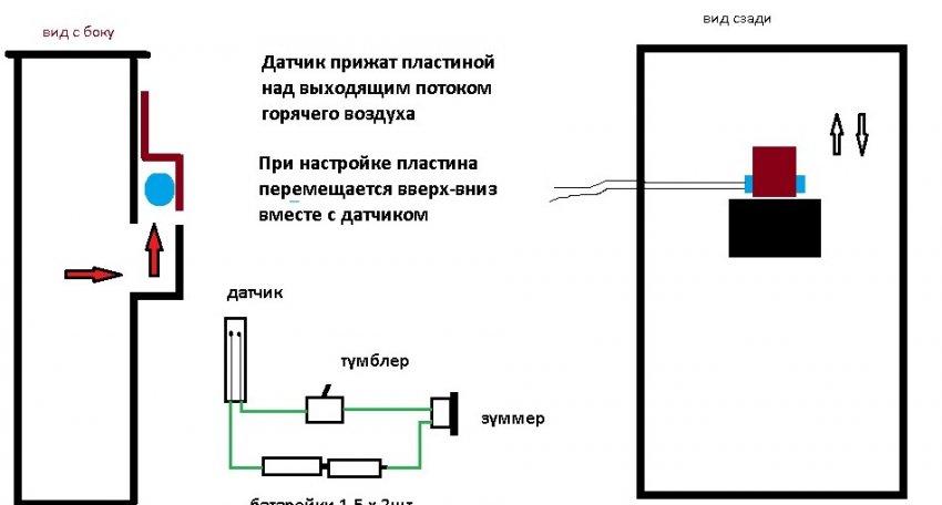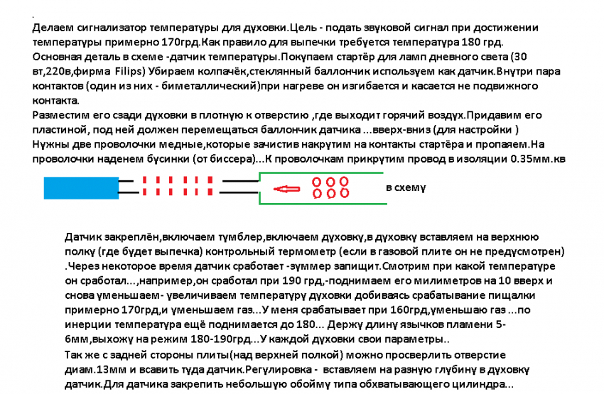 Детали для схемы : Датчик описан в статье - на фото конденсатор можно удалить,пищалка- купить в радиомагазине марка TMB12AO5 ( пищалка любая от детских игрушек с питанием 1.5-3в или с электронного будильника), батарейки любые или аккумулятор на 3,7 вольта от мобилок,или на рынке зарядное устройство на 3.7в, если на 5в зарядка придётся поставить гасящее сопротивление до 100ом (подобрать эксперементально),микровыключатель ( на фото -нет) любой тумблер... Вместо бисера (стеклянные колечки) можно купить стеклянные микротрубочки - это изоляия на проводки,которые рядом со стенкой духовки.Продаются в магазине для рукоделия .