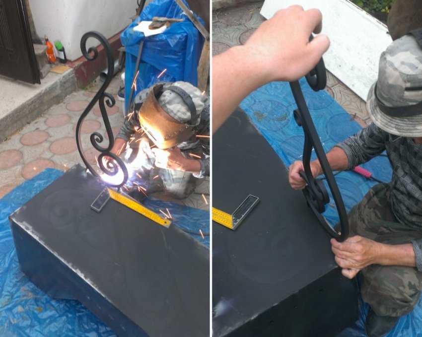 Сварив кованные элементы, получили ножки для мангала. Наварили еще пластины в местах сварки с мангалом.
