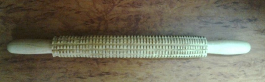Скалка, массажная она же скалка для валяние шерсти. Длина 70 см, диаметр получился 5.8 см.Из обычного продаваемого бруса, наверно сосна, брус 70 на 70. Изделие делалось для валения шерсти, для небольших деталий. Точил на токарном, после бормашинкой с небольшой дисковой фрезой прорезал канавки вдоль скалки. Получилась какая то кукуруза))). Сказали катать удобно, попросили сделать еще.
