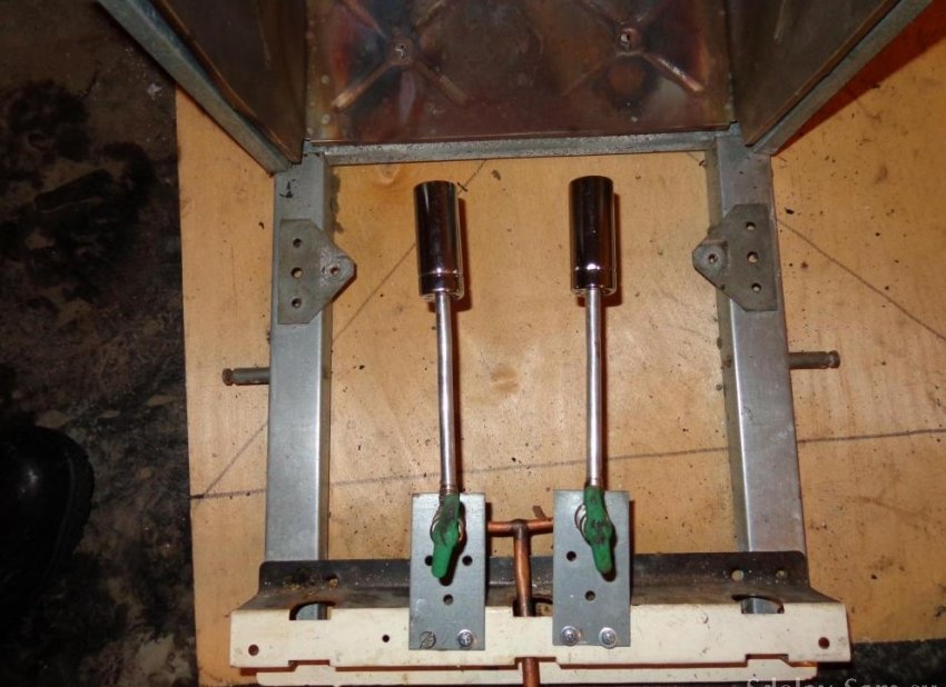 Вентиля открываются снизу, выводить ручки на корпус не стал, меня и так устраивает, разжигаю газ бытовой газовой зажигалкой для газовых плит.