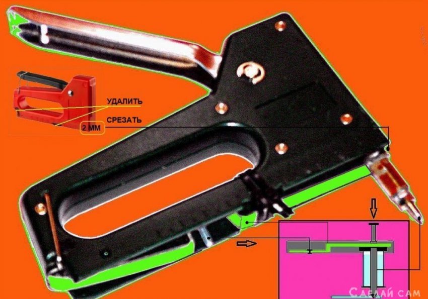 Обычно наступает момент, когда один из инструментов выходит из строя. Эта участь выпала строительному степлеру, когда он начал сминать скобы. Так как работоспобным у него остался ударный механизм, решено использовать его как автоматизированный керн.