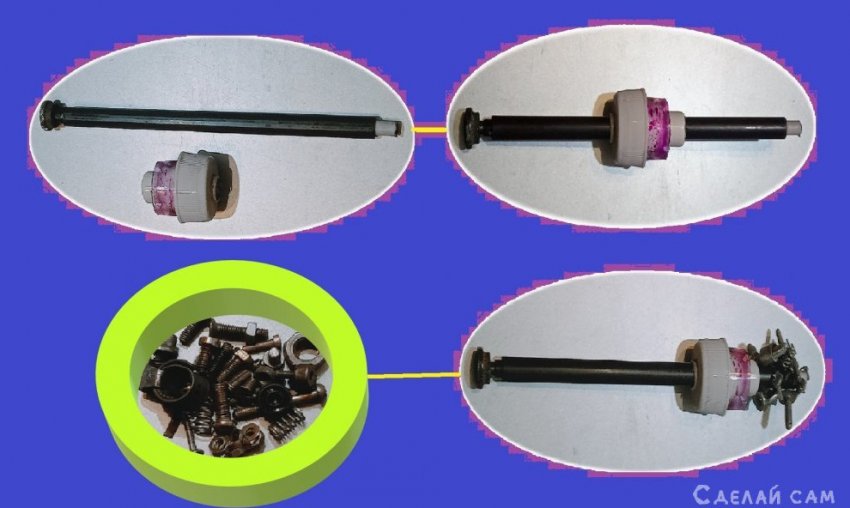 Съемное приспособление состоит из набора деталей сосудов: двух крышек, в которых имеются отверстия под диаметр барабана и длинного горлышка. Одна крышка с дозатором надета на резьбу горлышка, вторая вставлена в внутрь и удерживается в нем из-за разности диаметров его полого профиля.