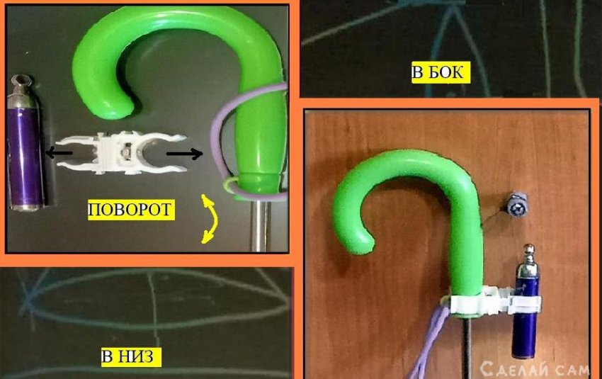 Как выше было сказано, что внутрь трубки зонта вставлена еще одна полая трубка, это было сделано с целью реализации еще одной функции трости - захвата деталей с помощью крючка. Для реализации этой функции внутрь трубок вставлена тонкая упругая лента (от китайского девайса). Один конец которой, со стороны упора, загнут крючком и входит внутрь свободного пространства упора. Второй конец ленты выходит из бокового  отверствия, просверленного в ручке на уровне верхнего конца трубок внутри ручки. Длина конца ленты имеет длину достаточную для свободного хода стальной ленты внутри трубок и позволяющего свободного выхода крючка из упора наружу примерно на 1,5 см. Для перемещения ленты на конце закреплена ручка из  пластмассовой трубки, в которую вмонтирован неодимовый магнит с винтом.