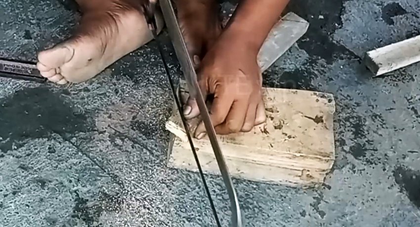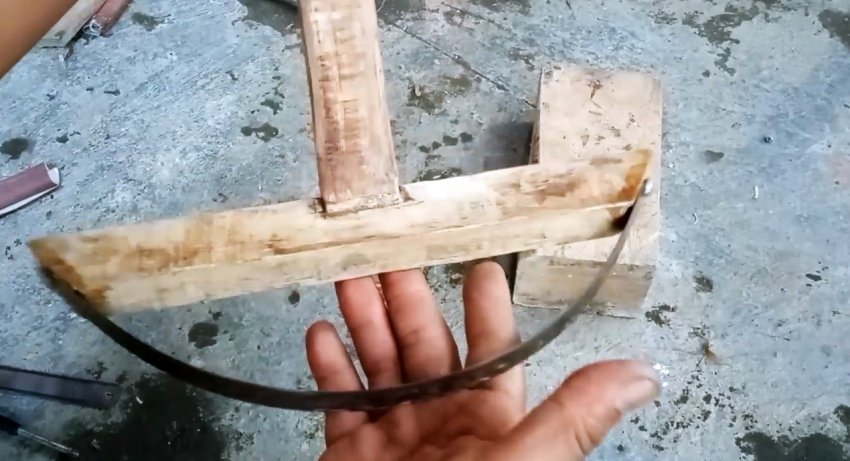 После разметки отрезаем от старого деревянного бруска заготовку, соразмерную по длине с полотном ножовки в согнутом положении по заранее выбранному радиусу изгиба. Концы заготовки из бруска срезаем под равным углом в одну и ту же сторону также, соответствующую подержанному полотну в согнутом виде.