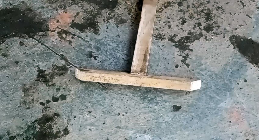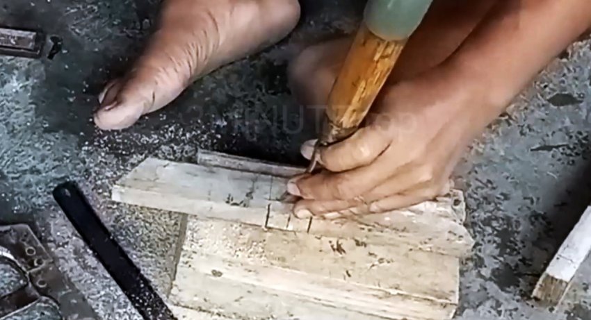 На деревянной заготовке по центру длинной стороны выполняем с помощью ножовки и стамески прямоугольный паз, равный по ширине и глубине более длинной заготовке, которая будет выполнять функцию ручки нашего будущего инструмента.
