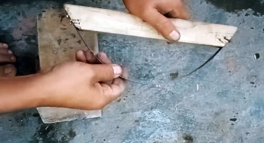 По длине косых срезов на поперечной заготовке выполняем углубления для закрепления в них концов согнутого полотна ножовки. Для стабилизации буртиков этих мелких углублений обильно пропитываем их суперклеем.