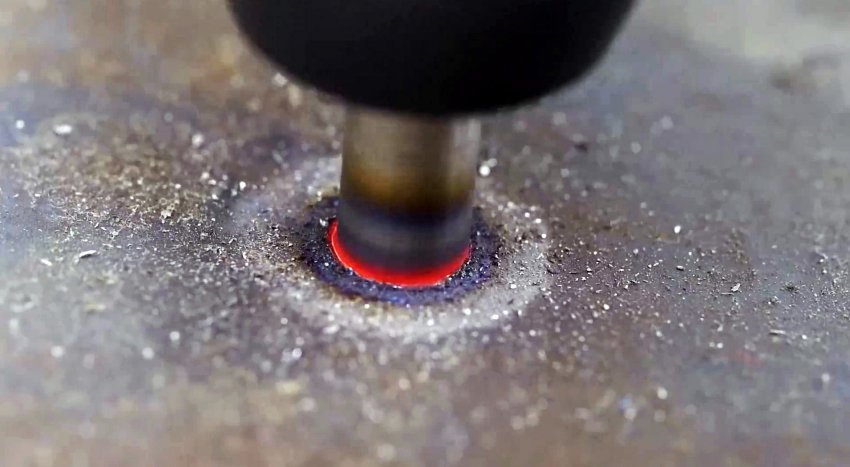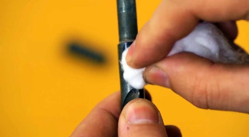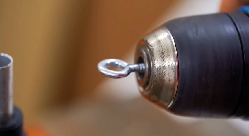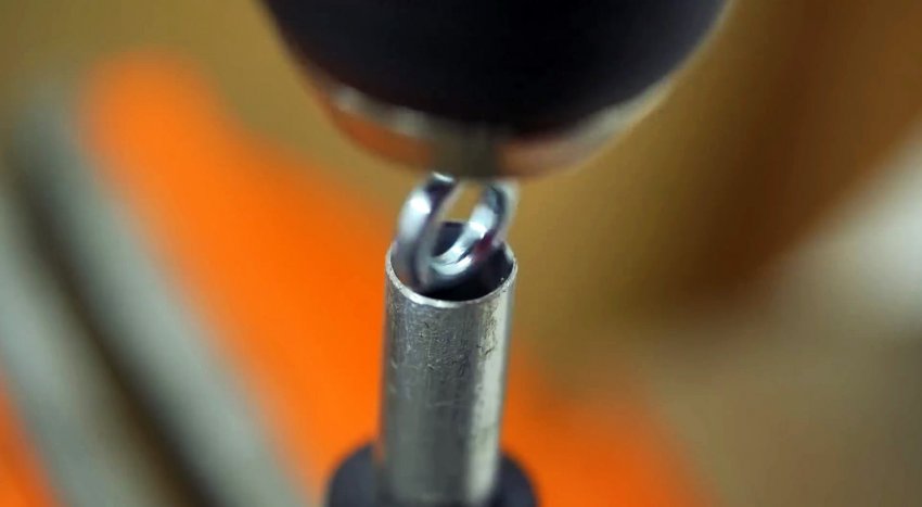 Зажимаем саморез в патроне дрели, включаем обороты и прижимаем кольцевую головку самореза к концу закрепленной трубки с некоторым давлением.