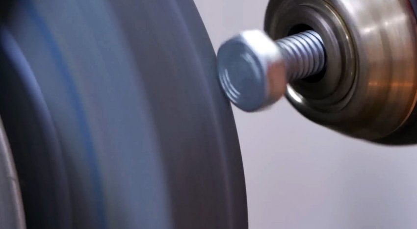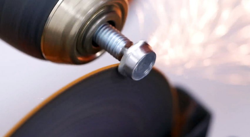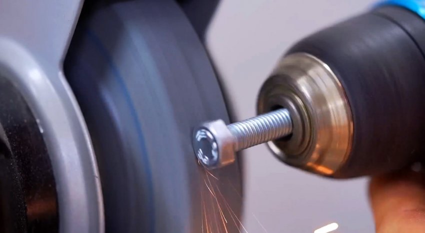 Для этого зажимаем болт в патроне дрели и превращаем шестигранную головку стандартного болта на наждаке в плоскую цилиндрическую головку.