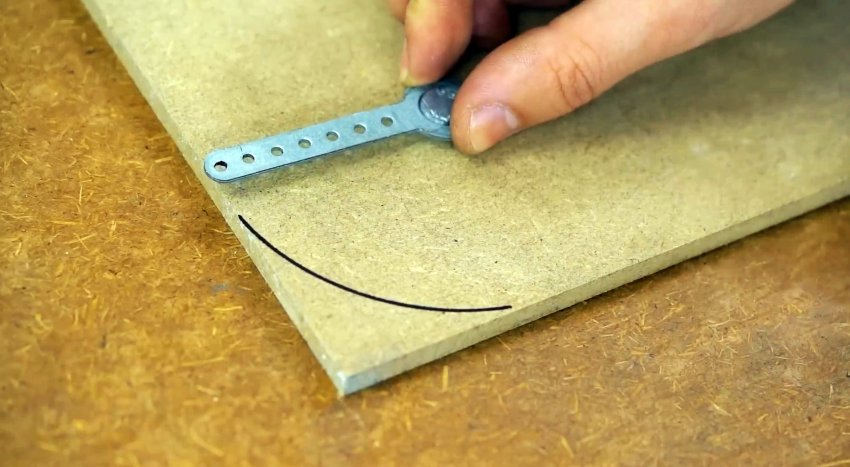 Отрезаем стержень чуть ниже головки и формируем в центре острый выступ. На остаток стержня набрасываем планку с отверстиями по длине и фиксируем скругленную головку болта в нужной точке размечаемой детали. В одно из отверстий на планке вставляем маркер и проводим окружность или часть дуги.