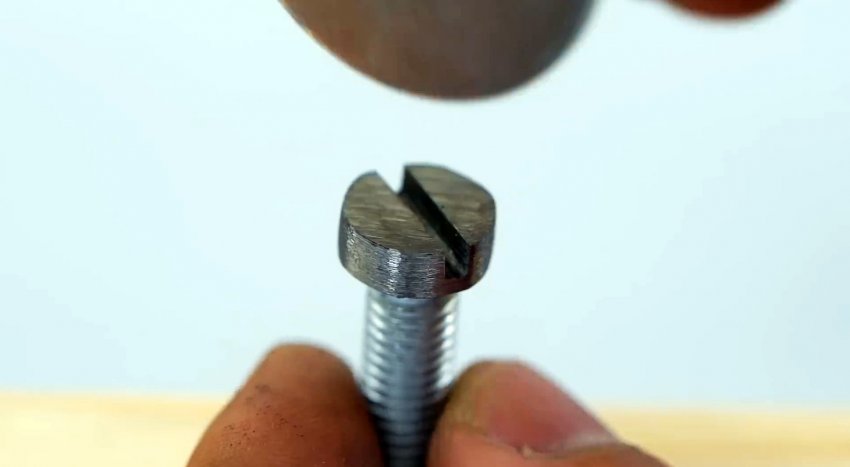 С помощью болгарки выполняем на ней шлицевой паз. Теперь мы можем закрутить болт с такой головкой в отверстие с помощью подходящей по толщине плоской шайбы.