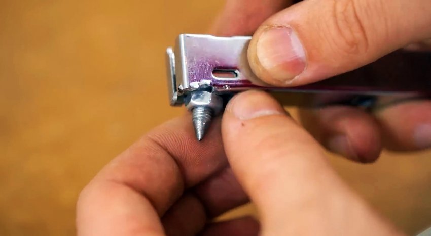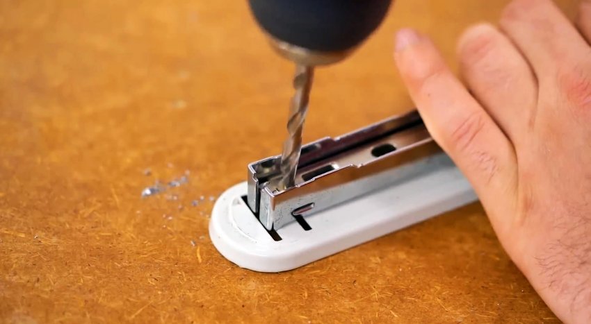 Снимаем с канцелярского степлера нижний пластиковый кожух, шайбу, а крайнее отверстие в желобе степлера, в который вставляются скобы, рассверливаем до диаметра болта с цилиндрической головкой и заостренным стержнем.