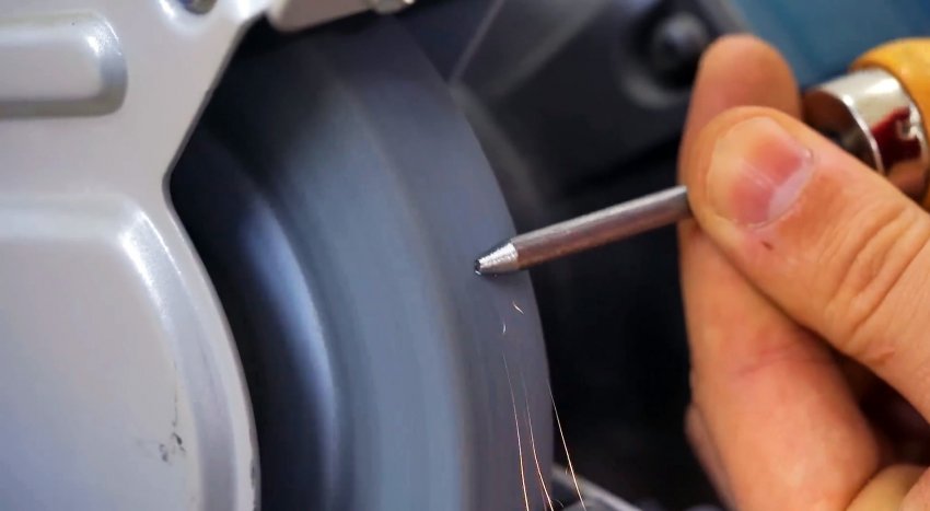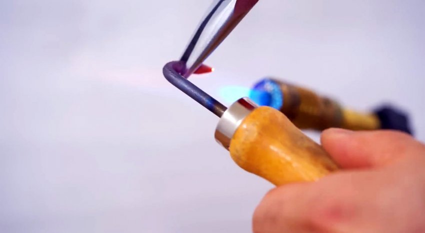 Заостряем конец стержня на наждаке, нагреваем его в пламени газовой горелки и, немного отступив от конца, сгибаем пассатижами под 90 градусов.