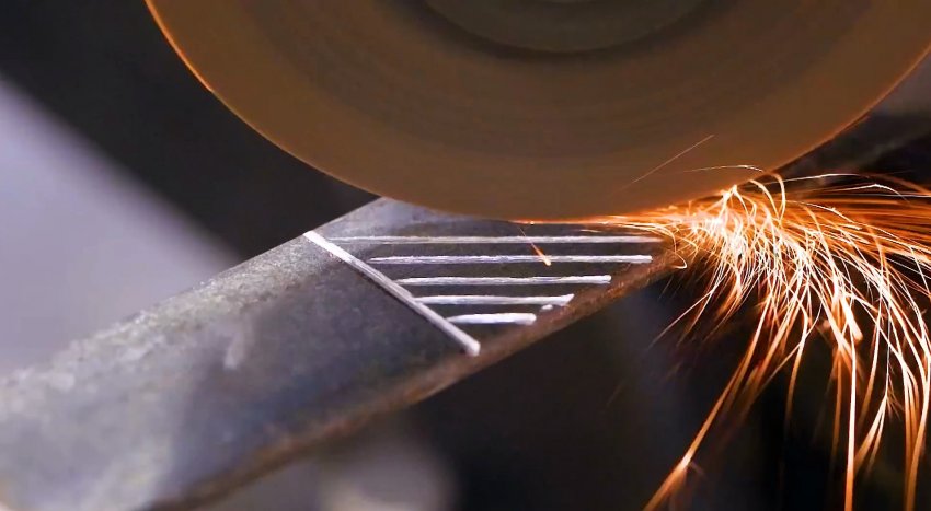 На части стальной пластины выполняем двойную насечку. Накладываем по длине такую же пластину, начиная от насечки. Выше насечки выполняем неглубокие прорези в пластинах.