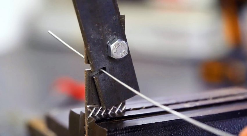 Над прорезями ближе к противоположному от них краю сверлим отверстия и соединяем пластины болтом и гайкой. Зажимаем край пластины с насечками в тиски. В совмещенные прорези помещаем проволоку, поворачиваем пластину вокруг болта и грани прорези легко разрежут проволоку.