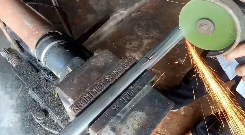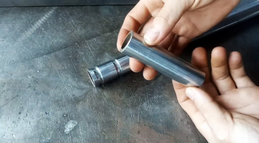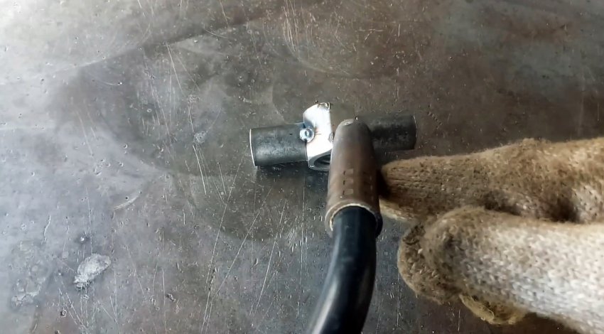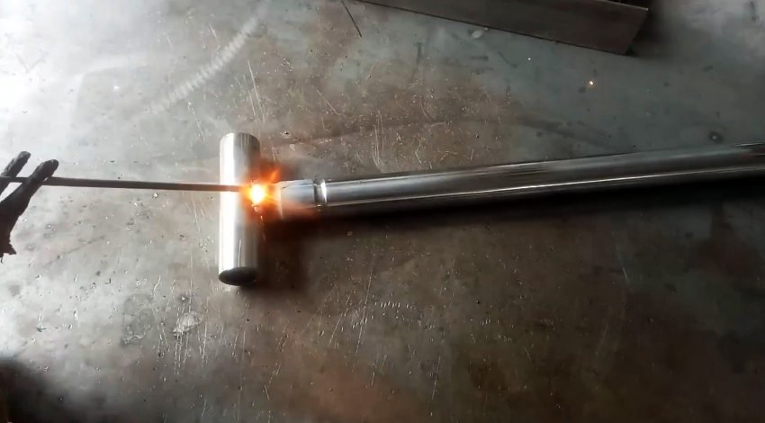От круглой трубы из нержавейки отрезаем фрагмент длиной, равной высоте швеллера, и привариваем поперечно к концу более длинной трубы так же из нержавейки.