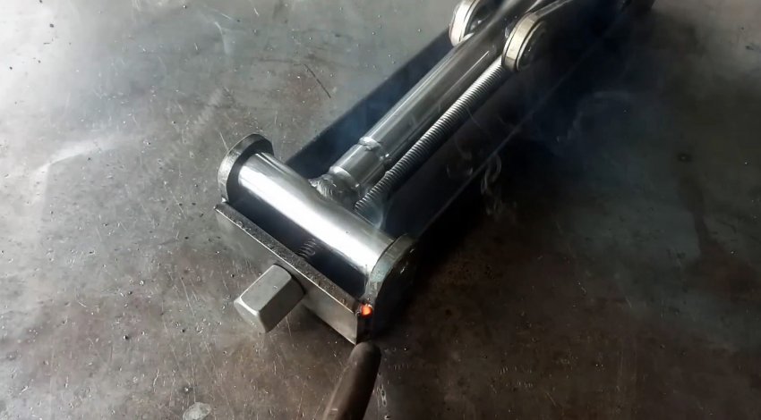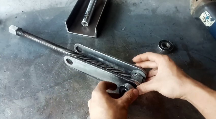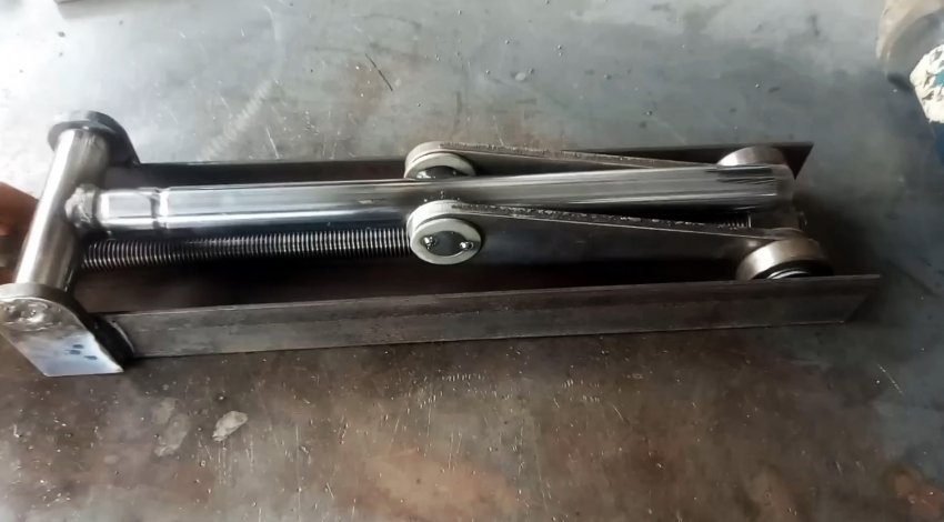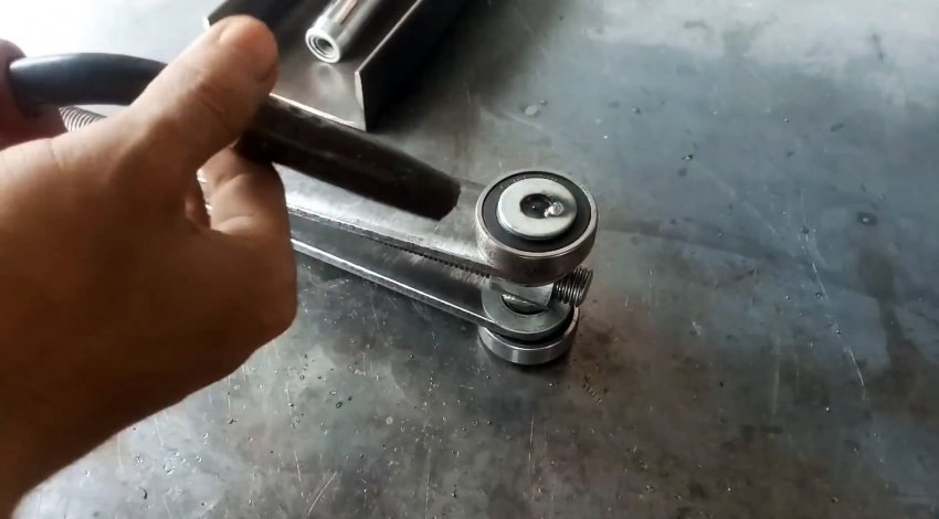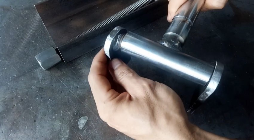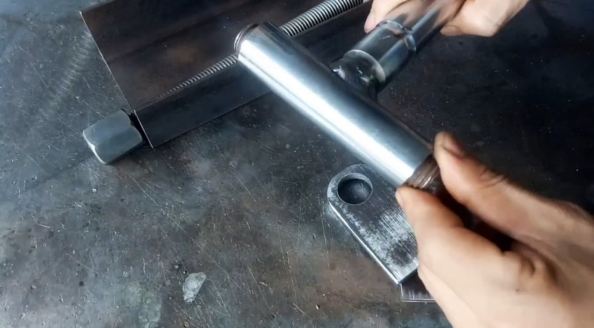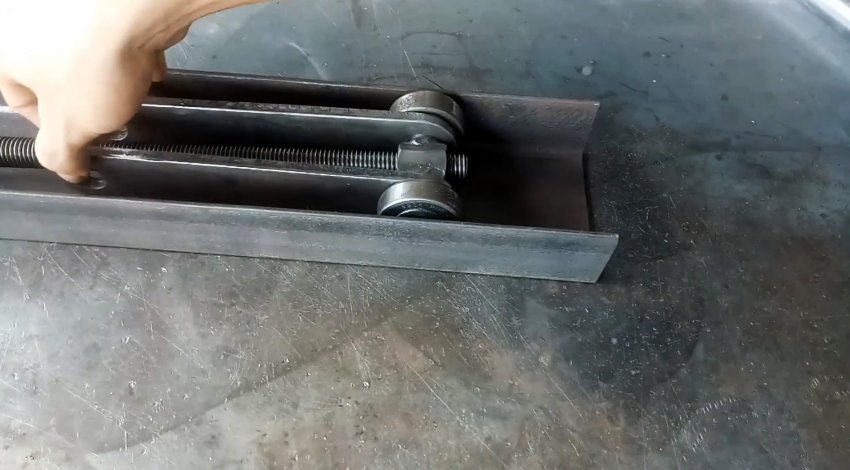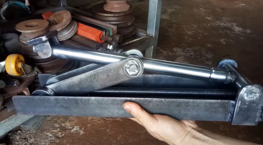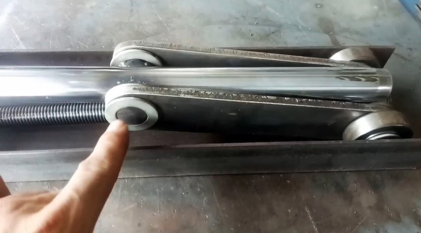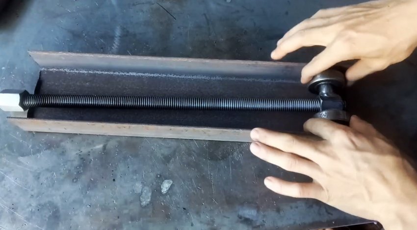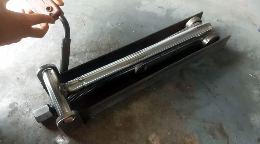 К торцу швеллера с ушками привариваем пластину с отверстием по центру для прохода ходового винта. Теперь при вращении удлиненной гайки-заглушки вправо винт вкручивается в гайку узла с подшипниками и перемещает его по швеллеру в сторону пластины. При этом длинные рычаги приподнимаются и через бобышки поднимают трубу из нержавейки.
