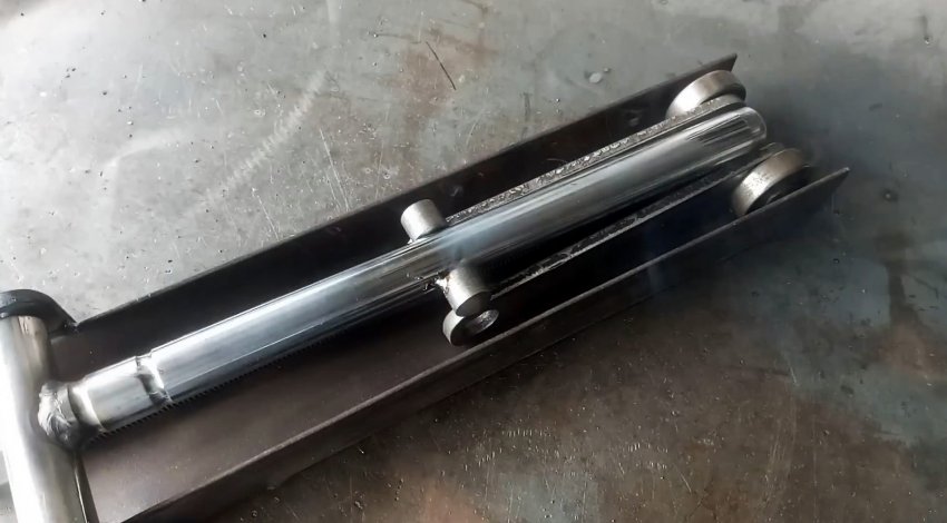 К длинной трубе из нержавейки, расположенной продольно внутри швеллера, привариваем горизонтально с двух сторон бобышки из отрезков круглого прутка, на которые надеваем шайбы и 2 полосы, надетые второй стороной на ось подшипников с шайбами. Наружные шайбы привариваем к бобышкам и оси.