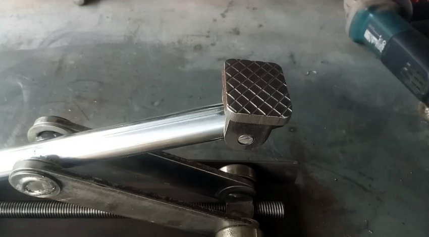 На конце трубы из нержавейки сверлим горизонтальное отверстие и посредством оси, пропущенной через него, и двух ушек привариваем само-устанавливающую опорную пятку с насечкой для взаимодействия с поднимаемым грузом.