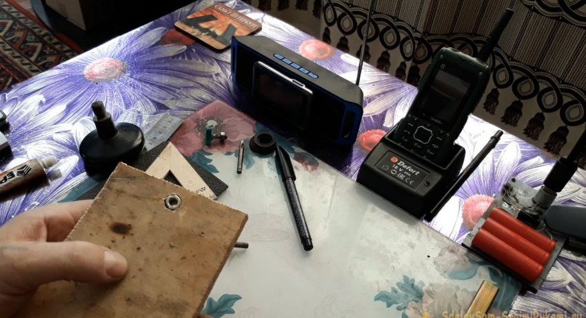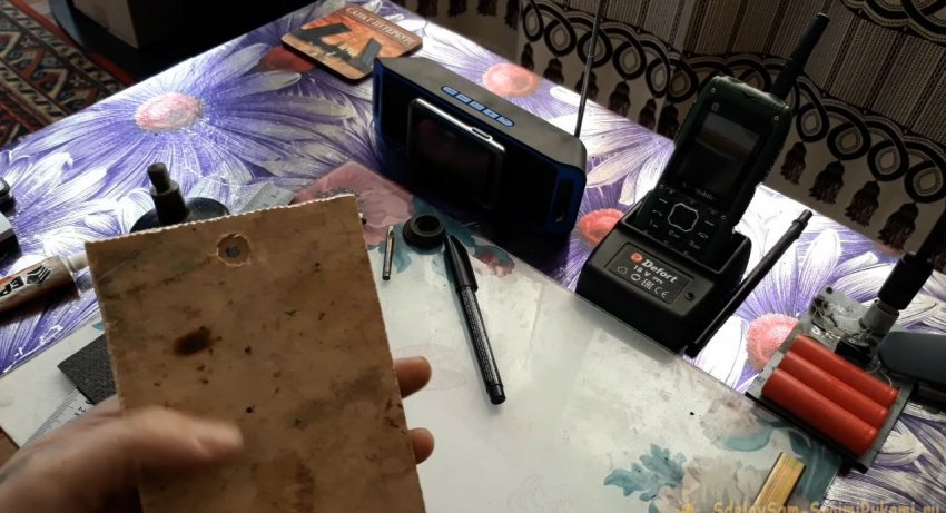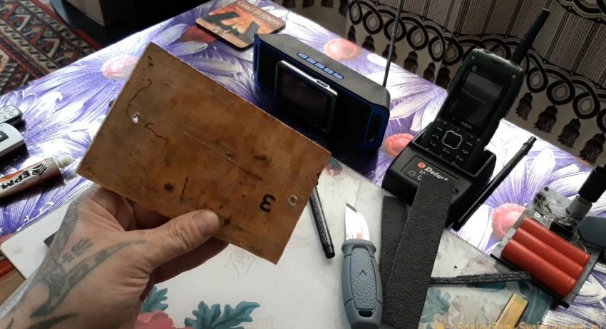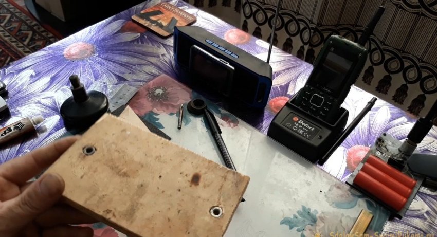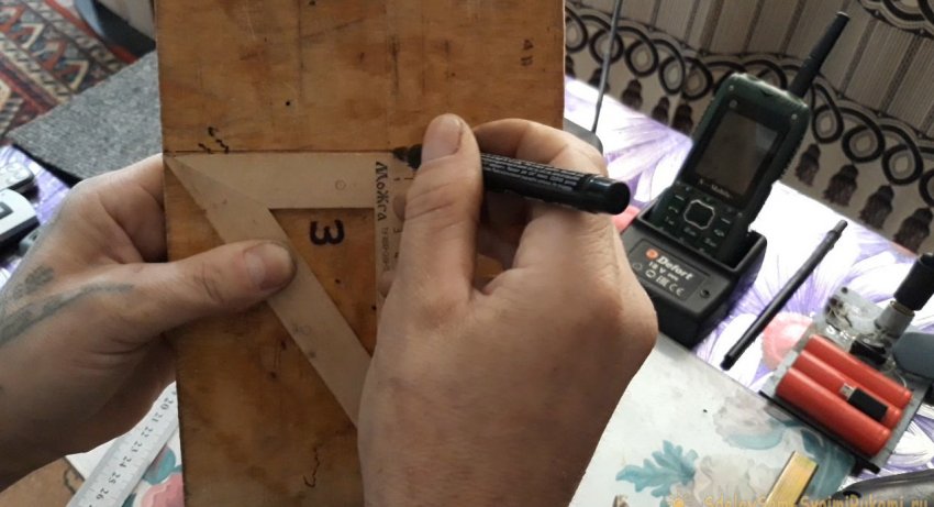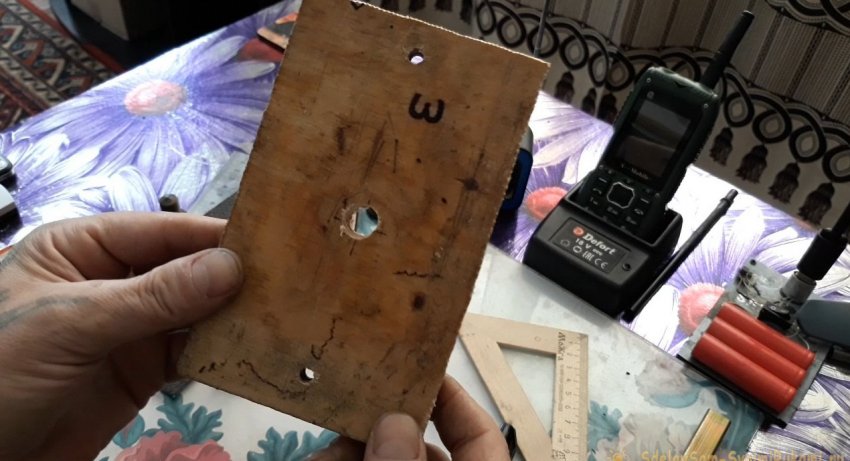 Далее требуется просверлить в фанере отверстия и потаи на них. Находим середину по ширине фанеры, отступаем от края 15 мм, и сверлим отверстие на 5 мм, для резьбы барашка. Ту же процедуру повторяем с противоположной стороны.